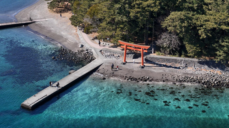 入江から外海に目を向けると、御浜崎の先端の赤い鳥居が映えます。その向こうには富士山。